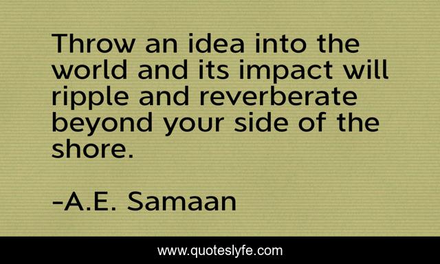 This page presents the quote "Throw an idea into the world and its impact will ripple and reverberate beyond your side of the shore.". Author of this quote is A.E. Samaan. This quote is about communication, ideas, capitalism, conversation, free-markets, invention, innovation, progress, technology,.