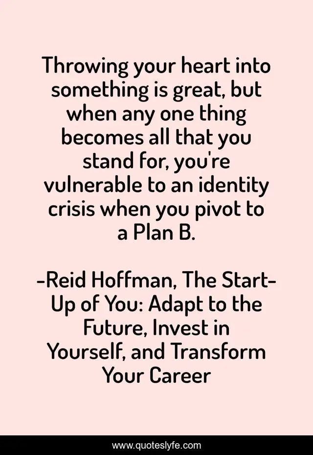 This page presents the quote "Throwing your heart into something is great, but when any one thing becomes all that you stand for, you're vulnerable to an identity crisis when you pivot to a Plan B.". Author of this quote is Reid Hoffman, The Start-Up of You: Adapt to the Future, Invest in Yourself, and Transform Your Career. This quote is about personal-branding, eggs-in-one-basket, career-planning, adaptation, identity-crisis, identity, plan-b, 2012,.
