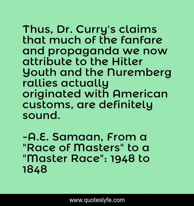 This page presents the quote "Thus, Dr. Curry's claims that much of the fanfare and propaganda we now attribute to the Hitler Youth and the Nuremberg rallies actually originated with American customs, are definitely sound.". Author of this quote is A.E. Samaan, From a "Race of Masters" to a "Master Race": 1948 to 1848. This quote is about hitler-youth, patriotism, american-heritage, pledge-of-allegiance, united-states, nuremberg-trials, propaganda,.