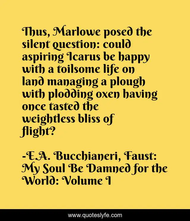 This page presents the quote "Thus, Marlowe posed the silent question: could aspiring Icarus be happy with a toilsome life on land managing a plough with plodding oxen having once tasted the weightless bliss of flight?". Author of this quote is E.A. Bucchianeri, Faust: My Soul Be Damned for the World: Volume I. This quote is about marlowe, christopher-marlowe, faustus, faustian, faust-legend, faust, ambition, pride, icarus,.