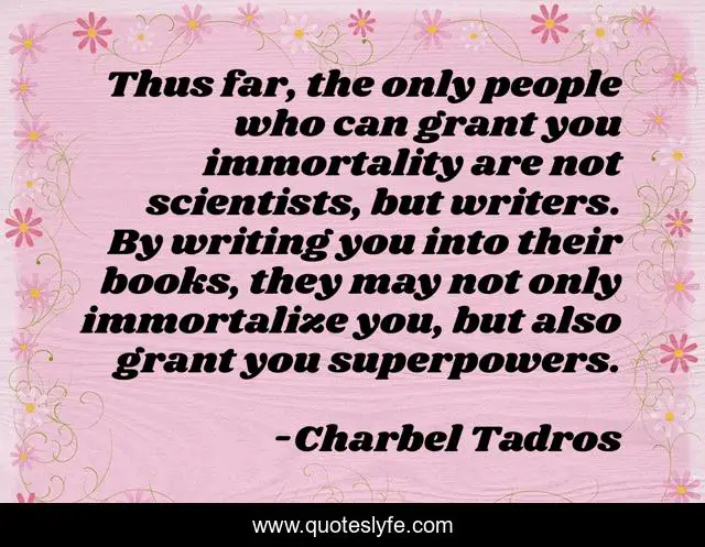 This page presents the quote "Thus far, the only people who can grant you immortality are not scientists, but writers. By writing you into their books, they may not only immortalize you, but also grant you superpowers.". Author of this quote is Charbel Tadros. This quote is about superpowers, novels, writers, immortality, books, stories, authors,.