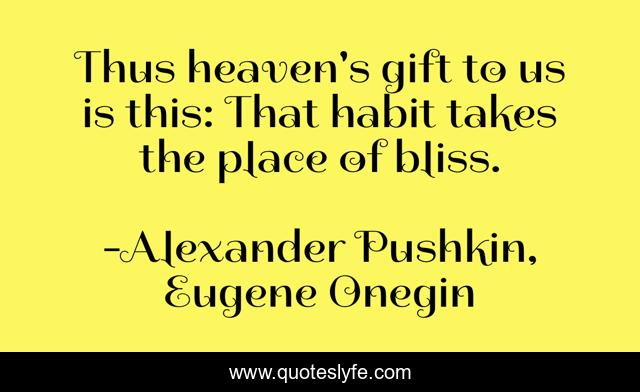 This page presents the quote "Thus heaven's gift to us is this: That habit takes the place of bliss.". Author of this quote is Alexander Pushkin, Eugene Onegin. This quote is about pessimistic, gift, grief, habits, bliss, optimistic, hope,.