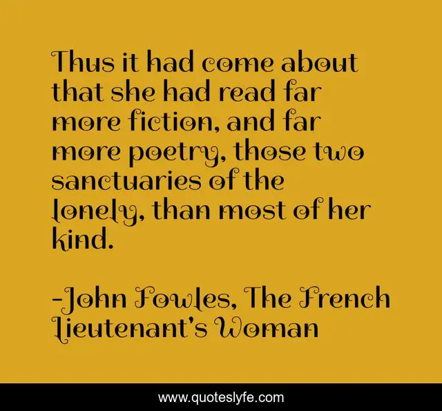 This page presents the quote "Thus it had come about that she had read far more fiction, and far more poetry, those two sanctuaries of the lonely, than most of her kind.". Author of this quote is John Fowles, The French Lieutenant's Woman. This quote is about quote, loneliness, books, lonely, poetry,.