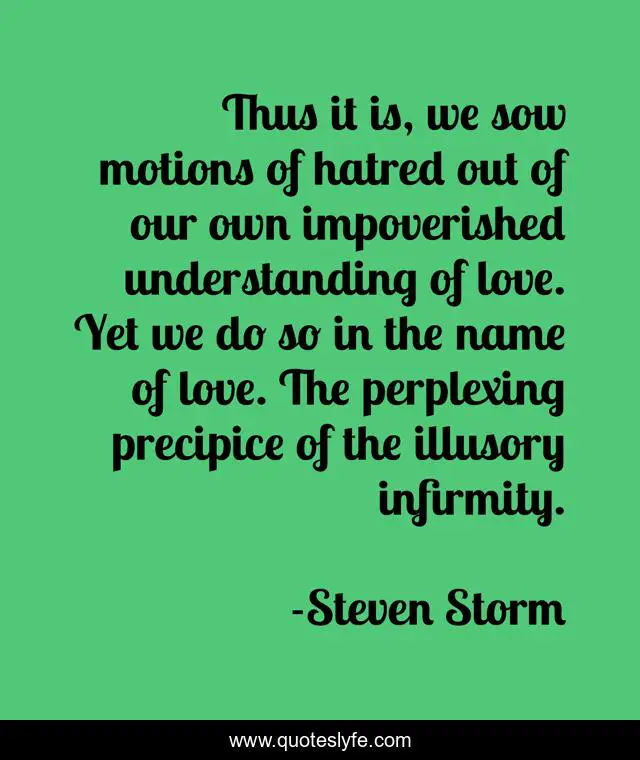 This page presents the quote "Thus it is, we sow motions of hatred out of our own impoverished understanding of love. Yet we do so in the name of love. The perplexing precipice of the illusory infirmity.". Author of this quote is Steven Storm. This quote is about poem, love, politicks, philosophy, poetry, religion, verse, poverty, society,.