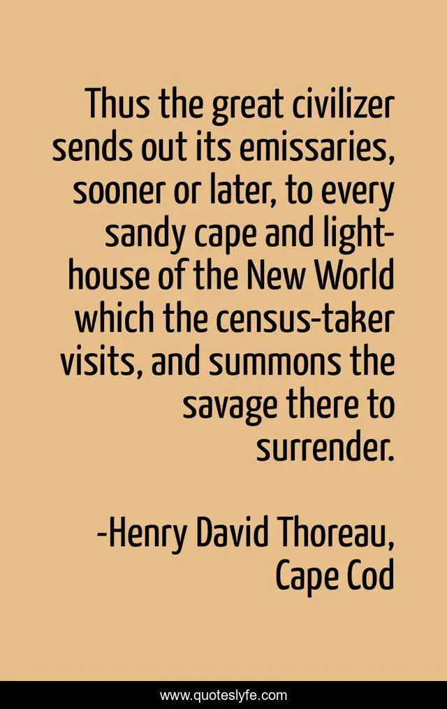 This page presents the quote "Thus the great civilizer sends out its emissaries, sooner or later, to every sandy cape and light-house of the New World which the census-taker visits, and summons the savage there to surrender.". Author of this quote is Henry David Thoreau, Cape Cod. This quote is about civilization, nature,.