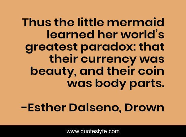 This page presents the quote "Thus the little mermaid learned her world’s greatest paradox: that their currency was beauty, and their coin was body parts.". Author of this quote is Esther Dalseno, Drown. This quote is about beauty, paradox, beauty-standards, shallowness, vanity,.