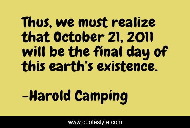 This page presents the quote "Thus, we must realize that October 21, 2011 will be the final day of this earth’s existence.". Author of this quote is Harold Camping. This quote is about spiritual, christianity, the-rapture, science-fiction, sci-fi,.
