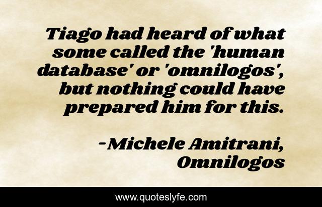 This page presents the quote "Tiago had heard of what some called the 'human database' or 'omnilogos', but nothing could have prepared him for this.". Author of this quote is Michele Amitrani, Omnilogos. This quote is about wei-wang, omnilogos, sci-fi, tiago,.