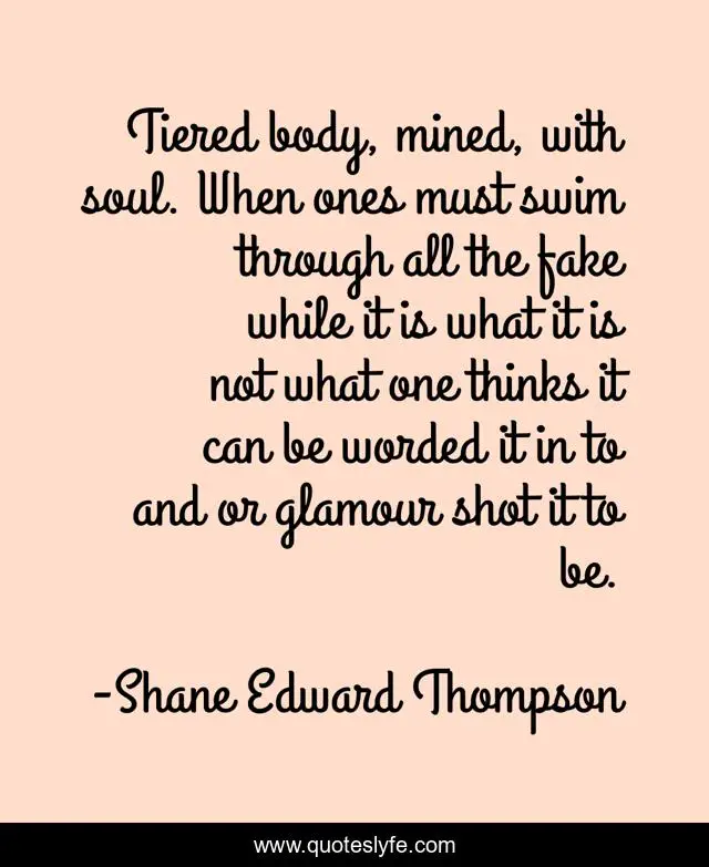 This page presents the quote "Tiered body, mined, with soul. When ones must swim through all the fake while it is what it is not what one thinks it can be worded it in to and or glamour shot it to be.". Author of this quote is Shane Edward Thompson. .