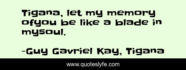 This page presents the quote "Tigana, let my memory ofyou be like a blade in mysoul.". Author of this quote is Guy Gavriel Kay, Tigana. This quote is about toasts, memory,.