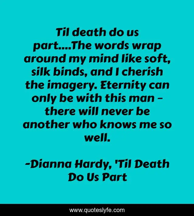 This page presents the quote "Til death do us part....The words wrap around my mind like soft, silk binds, and I cherish the imagery. Eternity can only be with this man – there will never be another who knows me so well.". Author of this quote is Dianna Hardy, 'Til Death Do Us Part. This quote is about eternity, love, marriage, affection,.