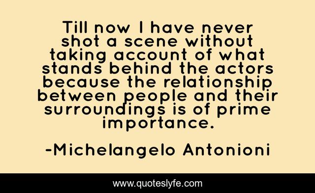 This page presents the quote "Till now I have never shot a scene without taking account of what stands behind the actors because the relationship between people and their surroundings is of prime importance.". Author of this quote is Michelangelo Antonioni. This quote is about surroundings, behind, people,.