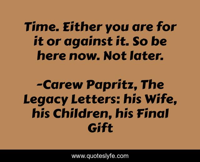 This page presents the quote "Time. Either you are for it or against it. So be here now. Not later.". Author of this quote is Carew Papritz, The Legacy Letters: his Wife, his Children, his Final Gift. This quote is about life, quote, live-now, life-and-sayings, quotes, live, book, books, the-legacy-letters,.