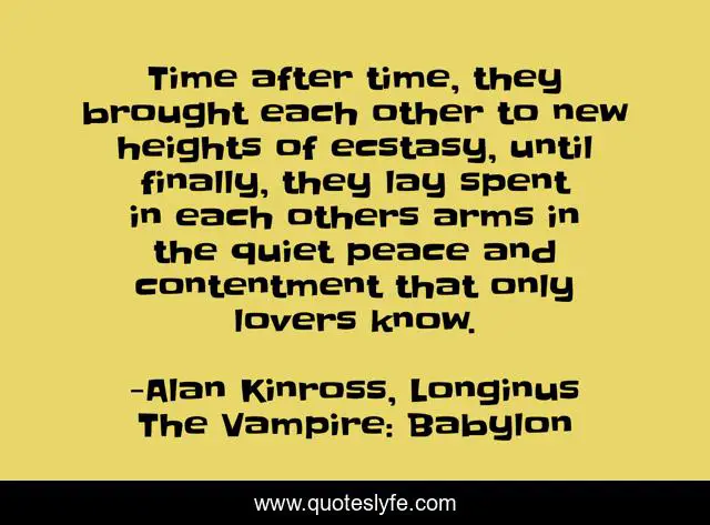 This page presents the quote "Time after time, they brought each other to new heights of ecstasy, until finally, they lay spent in each others arms in the quiet peace and contentment that only lovers know.". Author of this quote is Alan Kinross, Longinus The Vampire: Babylon. This quote is about ecstacy, lovers, love, peace, contentment, affection,.