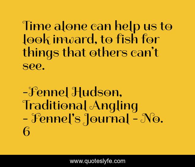 This page presents the quote "Time alone can help us to look inward, to fish for things that others can’t see.". Author of this quote is Fennel Hudson, Traditional Angling - Fennel's Journal - No. 6. This quote is about alone, explore, reflection, healing, self,.