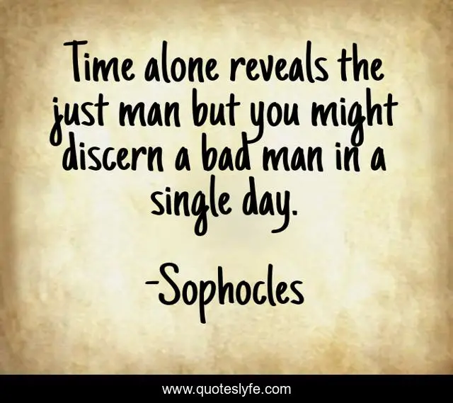 This page presents the quote "Time alone reveals the just man but you might discern a bad man in a single day.". Author of this quote is Sophocles. This quote is about time, day, man,.