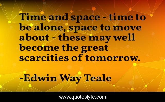 This page presents the quote "Time and space - time to be alone, space to move about - these may well become the great scarcities of tomorrow.". Author of this quote is Edwin Way Teale. This quote is about alone, great, space,.