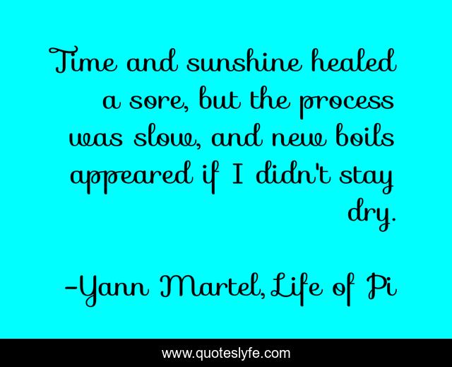 This page presents the quote "Time and sunshine healed a sore, but the process was slow, and new boils appeared if I didn't stay dry.". Author of this quote is Yann Martel, Life of Pi. This quote is about metaphor, suffering, healing, life-of-pi, time, pain,.