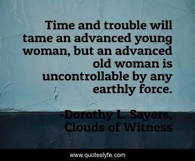 This page presents the quote "Time and trouble will tame an advanced young woman, but an advanced old woman is uncontrollable by any earthly force.". Author of this quote is Dorothy L. Sayers, Clouds of Witness. This quote is about woman, women,.