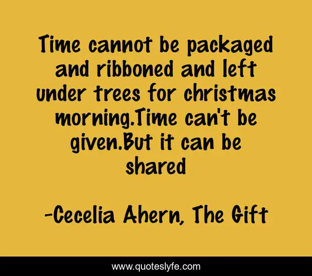 This page presents the quote "Time cannot be packaged and ribboned and left under trees for christmas morning.Time can't be given.But it can be shared". Author of this quote is Cecelia Ahern, The Gift. This quote is about enthusiasm, inspirational,.