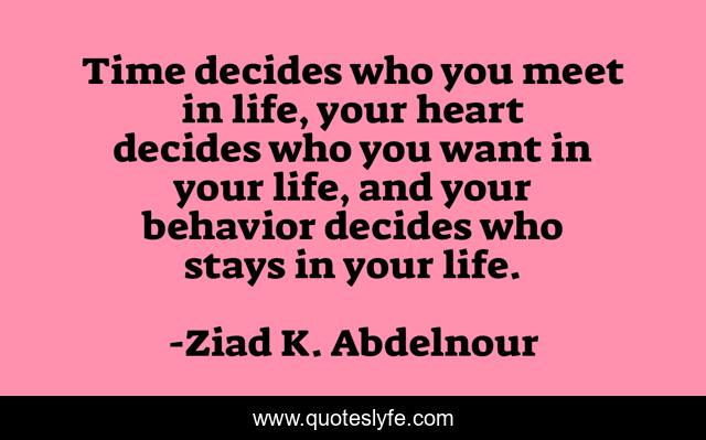 This page presents the quote "Time decides who you meet in life, your heart decides who you want in your life, and your behavior decides who stays in your life.". Author of this quote is Ziad K. Abdelnour. This quote is about heart, life, behavior, time,.