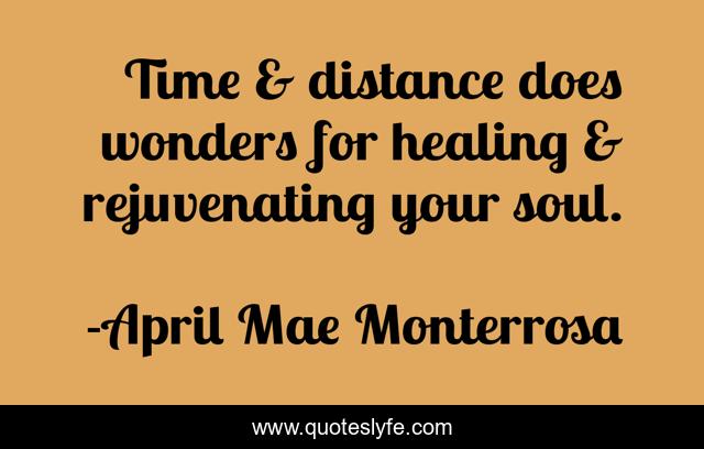 This page presents the quote "Time & distance does wonders for healing & rejuvenating your soul.". Author of this quote is April Mae Monterrosa. This quote is about distance, self-growth, rejuvenating, healing, time, moving-on,.
