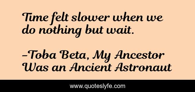 This page presents the quote "Time felt slower when we do nothing but wait.". Author of this quote is Toba Beta, My Ancestor Was an Ancient Astronaut. This quote is about feeling, waiting, relativity, time,.