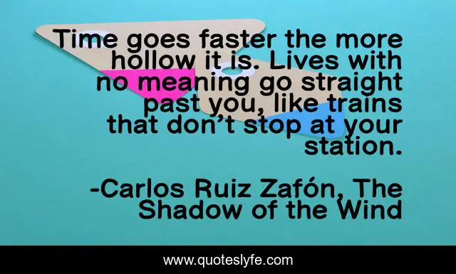 This page presents the quote "Time goes faster the more hollow it is. Lives with no meaning go straight past you, like trains that don’t stop at your station.". Author of this quote is Carlos Ruiz Zafón, The Shadow of the Wind. This quote is about time, trains,.