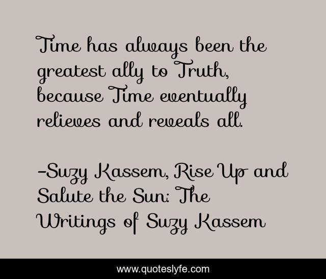 This page presents the quote "Time has always been the greatest ally to Truth, because Time eventually relieves and reveals all.". Author of this quote is Suzy Kassem, Rise Up and Salute the Sun: The Writings of Suzy Kassem. This quote is about reveal, life, death, hide, sickness, heal, overcoming-adversity, wounds, suffering,.