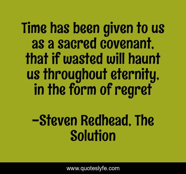 This page presents the quote "Time has been given to us as a sacred covenant, that if wasted will haunt us throughout eternity, in the form of regret". Author of this quote is Steven Redhead, The Solution. This quote is about covenant, eternity, regret, haunt, sacred, time, wasted,.