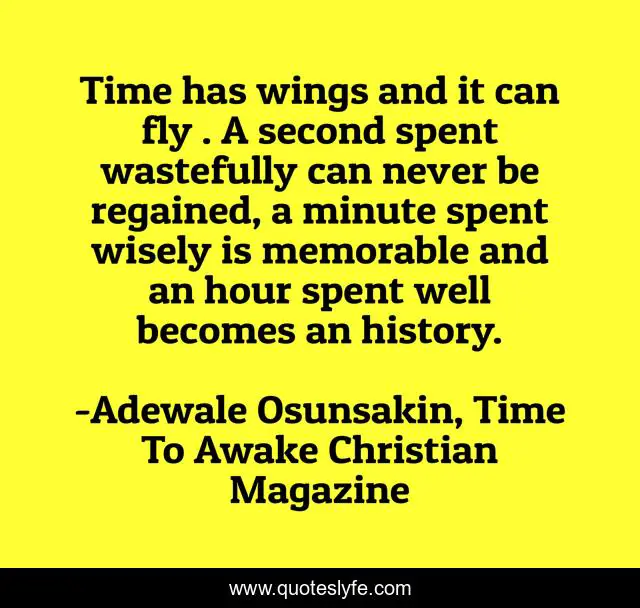This page presents the quote "Time has wings and it can fly . A second spent wastefully can never be regained, a minute spent wisely is memorable and an hour spent well becomes an history.". Author of this quote is Adewale Osunsakin, Time To Awake Christian Magazine. .
