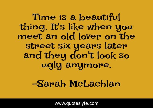 This page presents the quote "Time is a beautiful thing. It's like when you meet an old lover on the street six years later and they don't look so ugly anymore.". Author of this quote is Sarah McLachlan. This quote is about beautiful, ugly,.