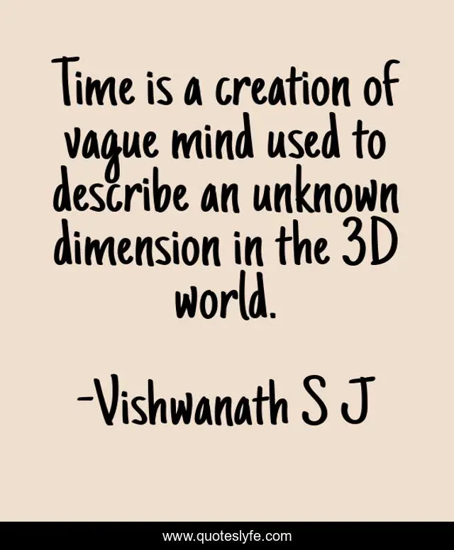This page presents the quote "Time is a creation of vague mind used to describe an unknown dimension in the 3D world.". Author of this quote is Vishwanath S J. This quote is about chapter, life, philosophy, dark-matter, quote, insecurity, time-travel, mind, interstellar,.