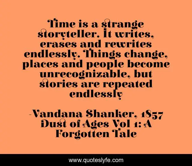 This page presents the quote "Time is a strange storyteller. It writes, erases and rewrites endlessly. Things change, places and people become unrecognizable, but stories are repeated endlessly". Author of this quote is Vandana Shanker, 1857 Dust of Ages Vol 1: A Forgotten Tale. This quote is about history, storytelling, time,.