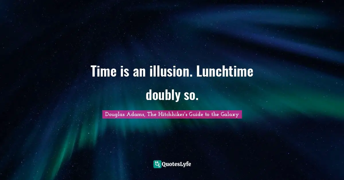 This page presents the quote "Time is an illusion. Lunchtime doubly so.". Author of this quote is Douglas Adams, The Hitchhiker's Guide to the Galaxy. This quote is about philosophy, humor, science-fiction,.