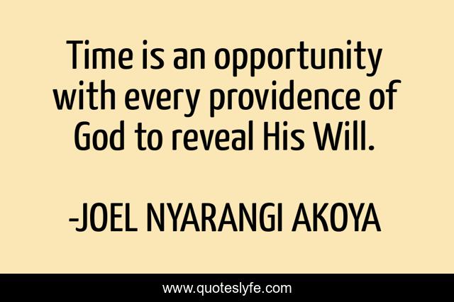 This page presents the quote "Time is an opportunity with every providence of God to reveal His Will.". Author of this quote is JOEL NYARANGI AKOYA. .