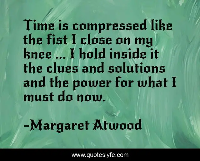 This page presents the quote "Time is compressed like the fist I close on my knee ... I hold inside it the clues and solutions and the power for what I must do now.". Author of this quote is Margaret Atwood. .
