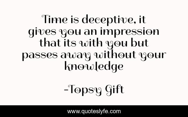 This page presents the quote "Time is deceptive, it gives you an impression that its with you but passes away without your knowledge". Author of this quote is Topsy Gift. This quote is about impression, deceptive, knowledge, passes, time, your, gives,.