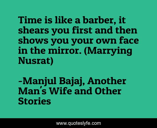 This page presents the quote "Time is like a barber, it shears you first and then shows you your own face in the mirror. (Marrying Nusrat)". Author of this quote is Manjul Bajaj, Another Man's Wife and Other Stories. .
