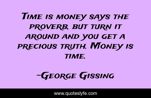 This page presents the quote "Time is money says the proverb, but turn it around and you get a precious truth. Money is time.". Author of this quote is George Gissing. This quote is about money, time,.