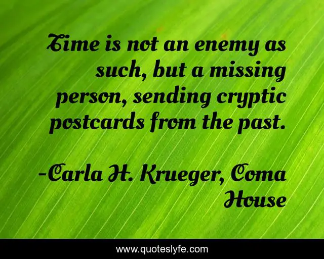 This page presents the quote "Time is not an enemy as such, but a missing person, sending cryptic postcards from the past.". Author of this quote is Carla H. Krueger, Coma House. This quote is about relationships, past, author-carla-h-krueger, madness, freedom, challenge, uncertainty, escape, life,.