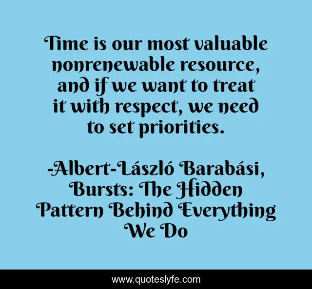This page presents the quote "Time is our most valuable nonrenewable resource, and if we want to treat it with respect, we need to set priorities.". Author of this quote is Albert-László Barabási, Bursts: The Hidden Pattern Behind Everything We Do. This quote is about time-management, priorities, resources, time,.