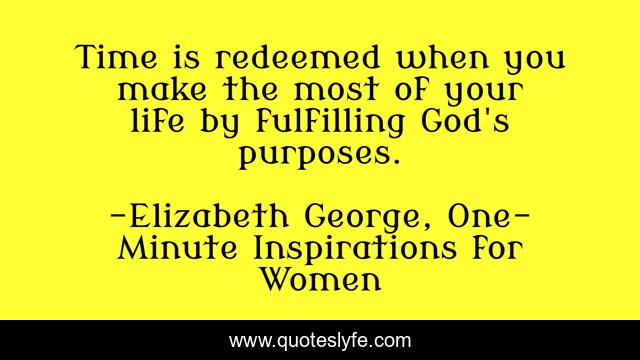 This page presents the quote "Time is redeemed when you make the most of your life by fulfilling God's purposes.". Author of this quote is Elizabeth George, One-Minute Inspirations for Women. This quote is about faith, life, men, christian, god, joy, peace, redeem, purpose,.