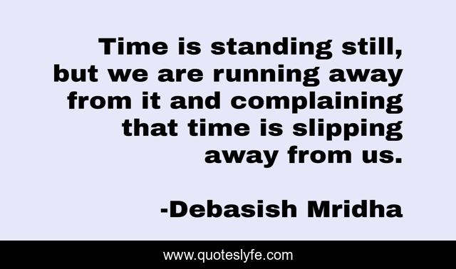 This page presents the quote "Time is standing still, but we are running away from it and complaining that time is slipping away from us.". Author of this quote is Debasish Mridha. This quote is about time-is-slipping-away, philosophy, debasish-mridha, quotes, inspirational, time, enthusiasm, debasish-mridha-m-d, what-is-time,.