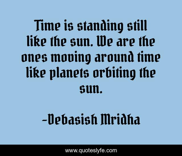 This page presents the quote "Time is standing still like the sun. We are the ones moving around time like planets orbiting the sun.". Author of this quote is Debasish Mridha. This quote is about philosophy, debasish-mridha, quotes, time-is-standing-still, planets-orbiting-the-sun, inspirational, time, enthusiasm, debasish-mridha-m-d,.