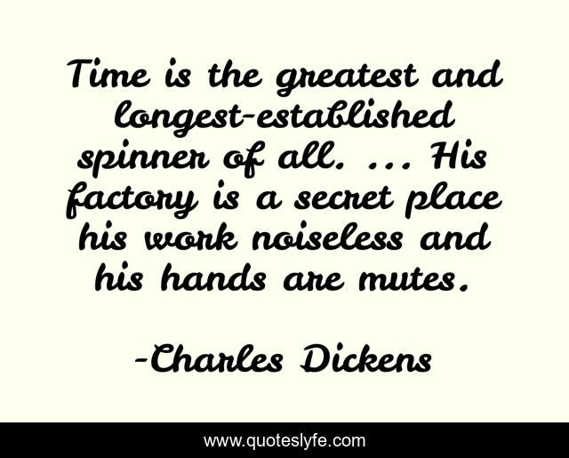 This page presents the quote "Time is the greatest and longest-established spinner of all. ... His factory is a secret place his work noiseless and his hands are mutes.". Author of this quote is Charles Dickens. This quote is about day, one,.