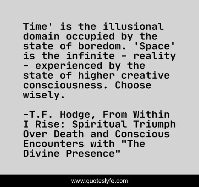 This page presents the quote "Time' is the illusional domain occupied by the state of boredom. 'Space' is the infinite - reality - experienced by the state of higher creative consciousness. Choose wisely.". Author of this quote is T.F. Hodge, From Within I Rise: Spiritual Triumph Over Death and Conscious Encounters with "The Divine Presence". This quote is about domain, concept, consciousness, space, illusion, creation, creativity, reality, creative,.