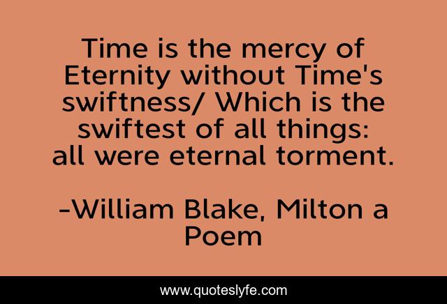 This page presents the quote "Time is the mercy of Eternity without Time's swiftness/ Which is the swiftest of all things: all were eternal torment.". Author of this quote is William Blake, Milton a Poem. .
