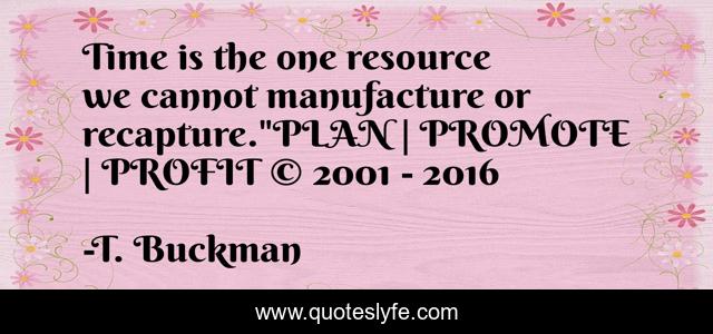This page presents the quote "Time is the one resource we cannot manufacture or recapture."PLAN | PROMOTE | PROFIT © 2001 - 2016". Author of this quote is T. Buckman. This quote is about business-success, enthusiasm, business-advice, business, inspirational,.