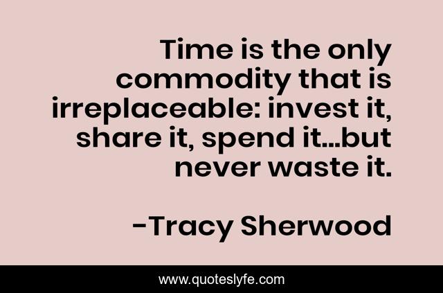 This page presents the quote "Time is the only commodity that is irreplaceable: invest it, share it, spend it...but never waste it.". Author of this quote is Tracy Sherwood. This quote is about time-management, time-slipping, time,.